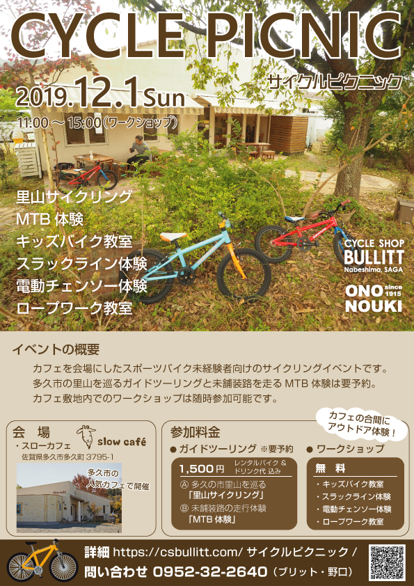 多久市の里山を巡る自転車ツーリングやMTBでの未舗装路走行という魅力的なイベントです。会場は多久市のスローカフェさん。大変人気なカフェですが、お庭も魅力で、このスペースをお借りして無料のワークショップを開催します。