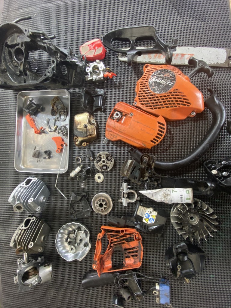 今回の機体は、共立さんの小型軽量タイプ。小型化するにあたり色々複雑に工夫して設計してあるので分解するのにもなかなか骨が折れます。(数をこなせばそうでも無いかも)