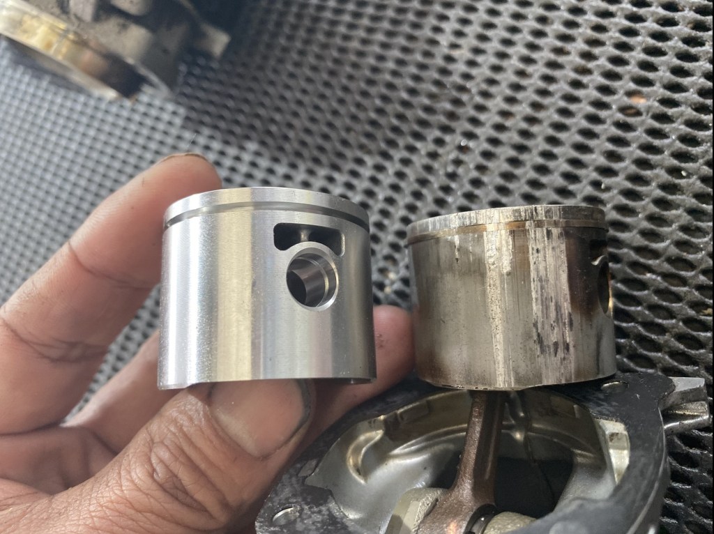 この機体の場合はピストンKIT/シリンダー/ガスケットと骨組みのエンジンカバーの交換も必要でした。※もっとひどい場合はクランク部も交換が必要になります。