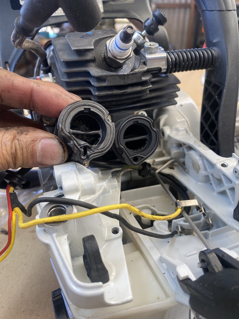 スチールさんのエンジンチェンソー MS 241 C-M を2022年7月に購入頂いたお客様から「スロットルを握ったら回転が上がらずにエンジンが停止する」との事。「買ったのは去年だけど、下したのは昨日(2023年1月中旬)が初めてなんだよぉ。優しくアクセルを握ると回ったりすることがあるんだけど、コンピューター制御って易しく扱わないと駄目なのかなぁ?」と悲しげにおっしゃいます。。いやいやそんな事無いですよ!と私もエンジンを掛けてみると、おっしゃる通りでアクセルを握るとエンジンが止まります💦