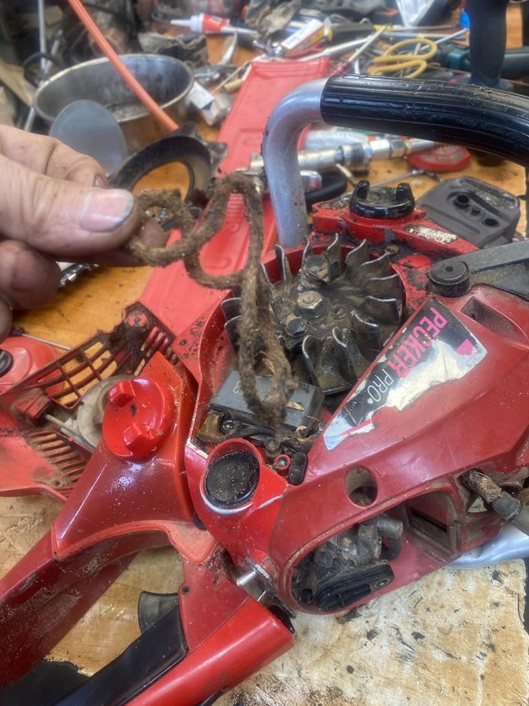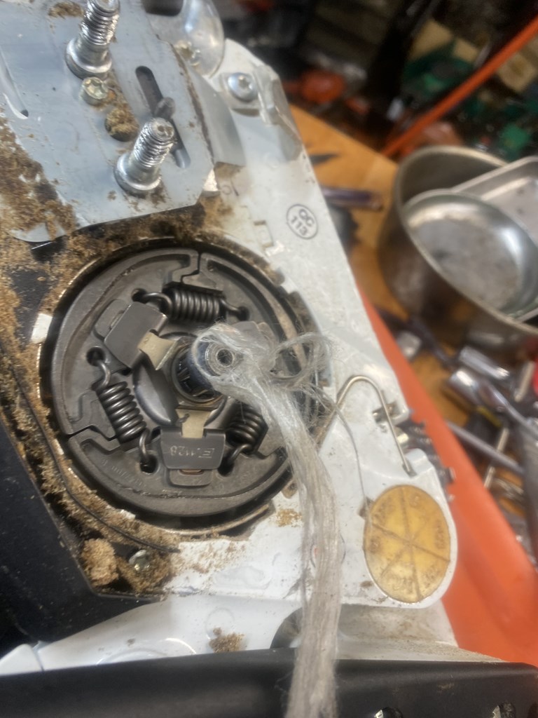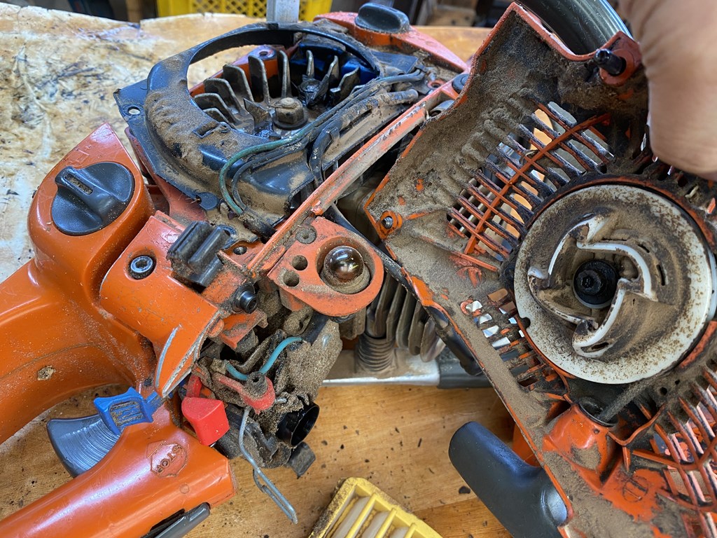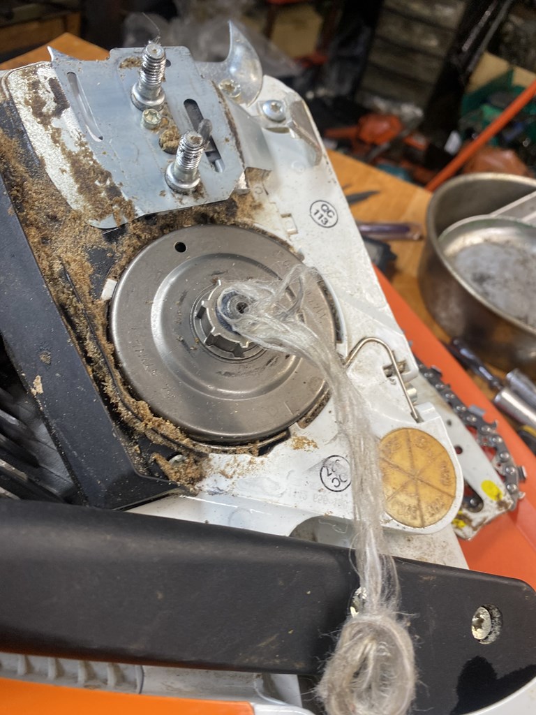チェンソーのチェンが回らないとの事で朝一ご来店。ガラス繊維の様な物がチェーンを回すスプロケット周りに噛みこんでいました。