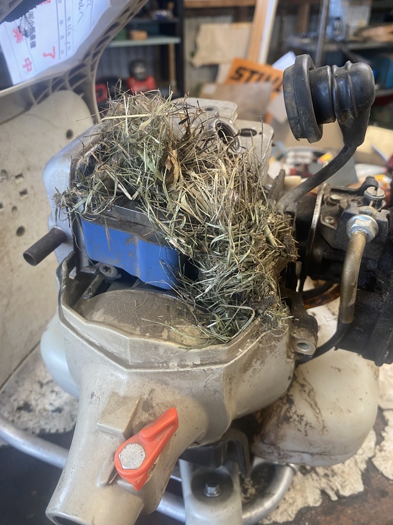 ブロワーで舞い上がった草を草刈機が吸い込んでしまった、そうとしか考えらえません。