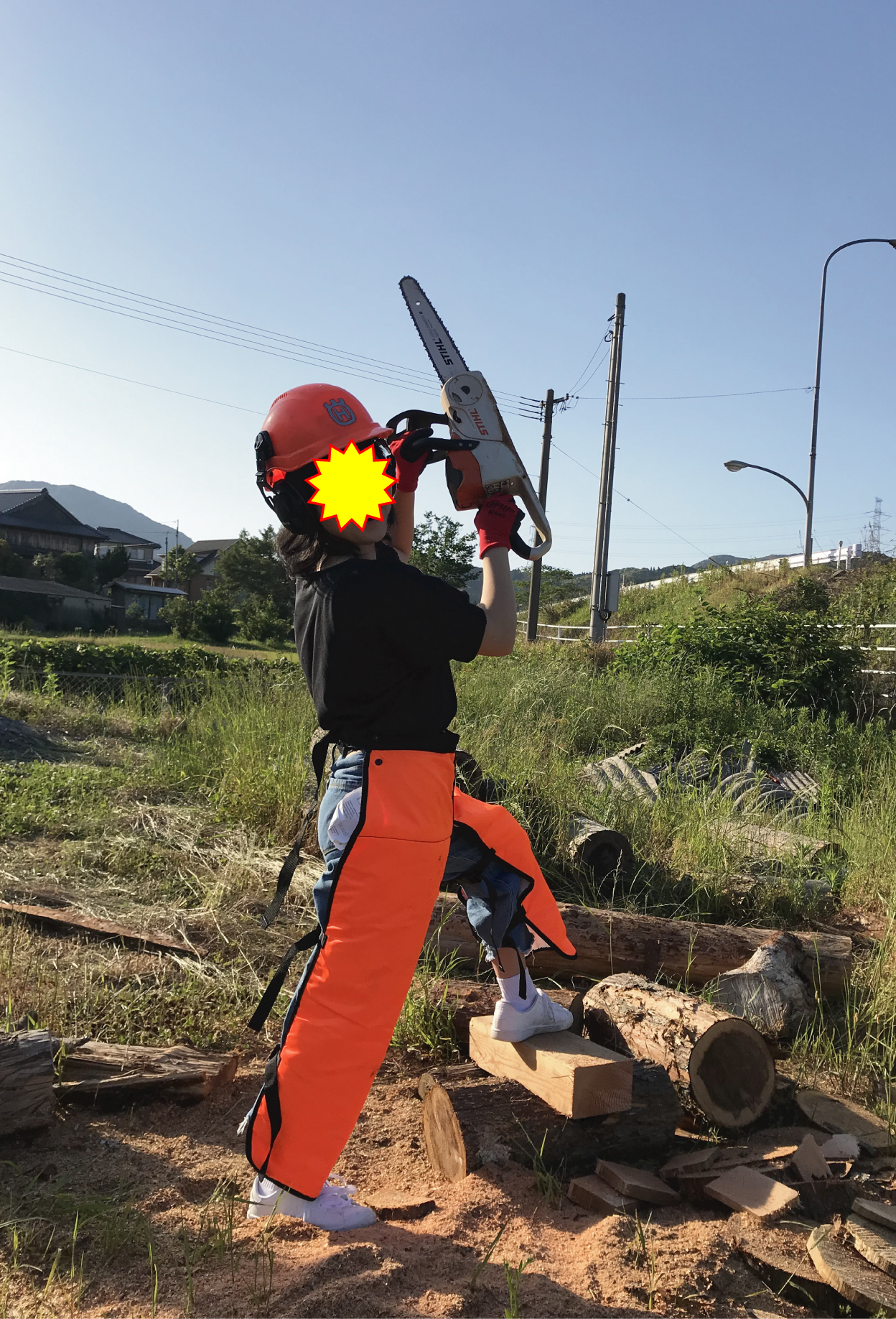 チャップス(防護服)を装着し安全に留意してのバッテリーチェンソー体験です。のりのりで会心のポーズを決めてくれました(^^)/