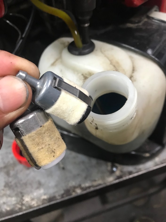 エアーフィルターの清掃と燃料フィルターの交換を行った状態で5分程稼働させてみると先ほどの不具合は出なくなりました。やはり燃料フィルターが目詰まりを起こしたせいで、必要な量の燃料がキャブレターへ供給出来なかった事が、出力不足の原因だった様です。